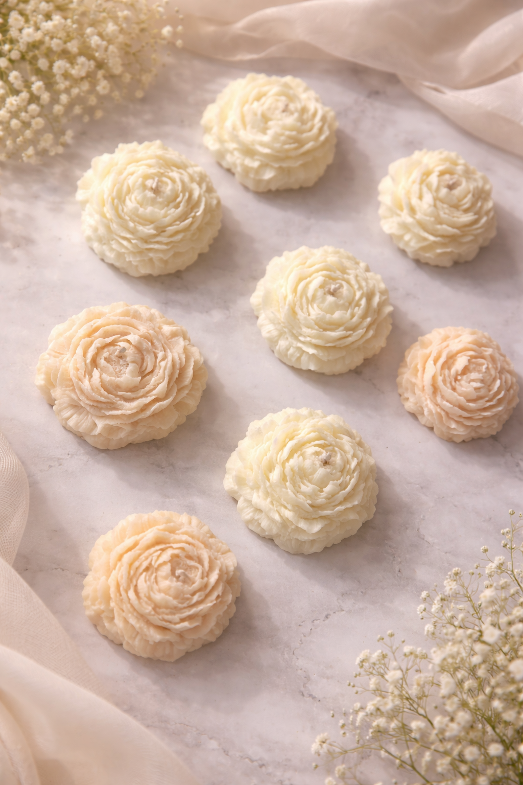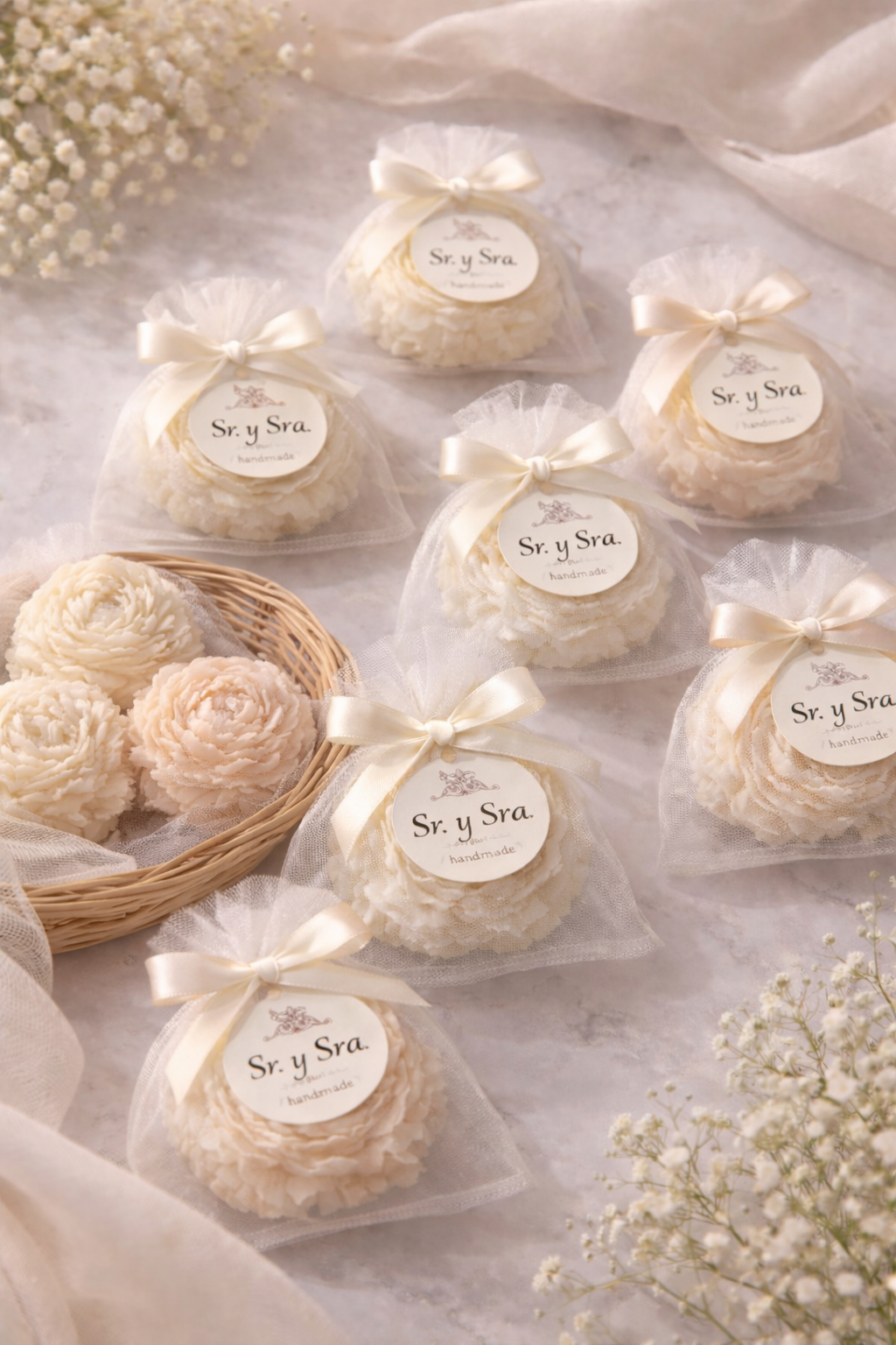 🌺 Peonia (Hechas con cera de soja natural con mecha de algodón) 🌿 Esencia a elegir 🎀 Lazo 🎁 Tul